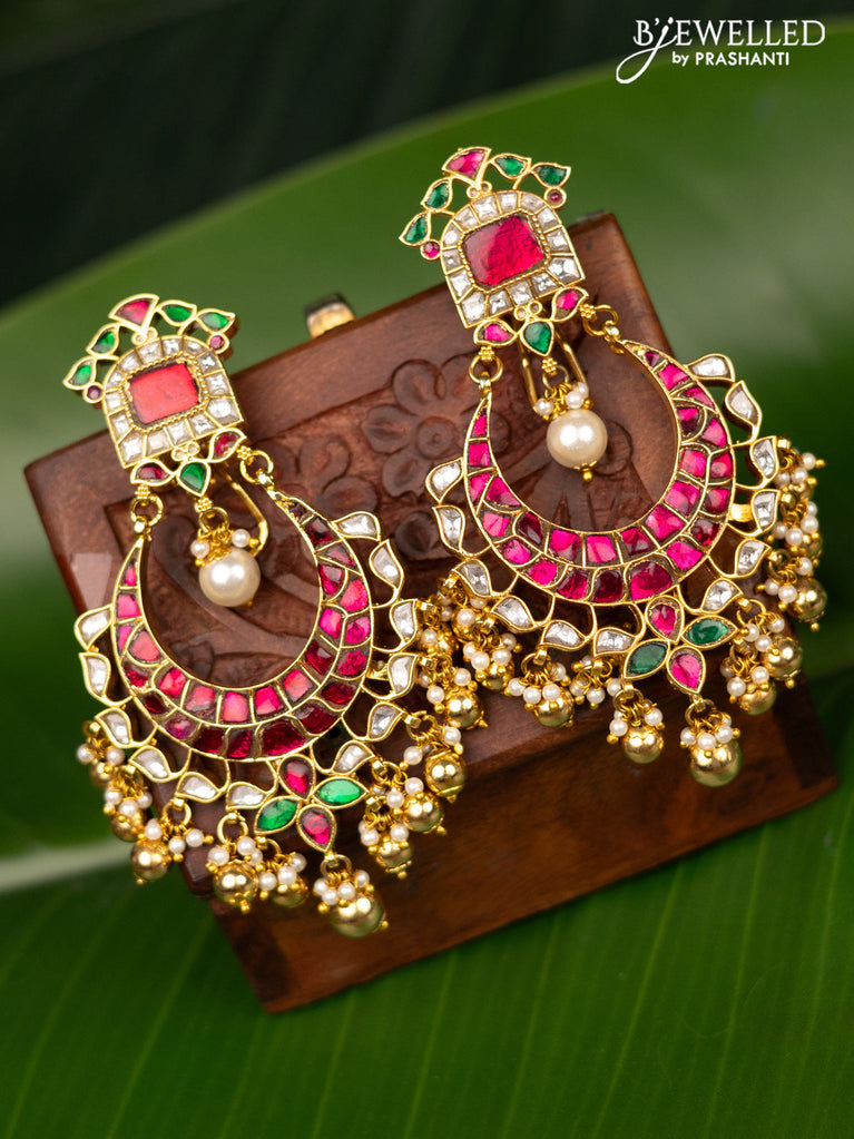 Antique screw type jhumka chandbali design with jadau kundan stones and pearl hangings