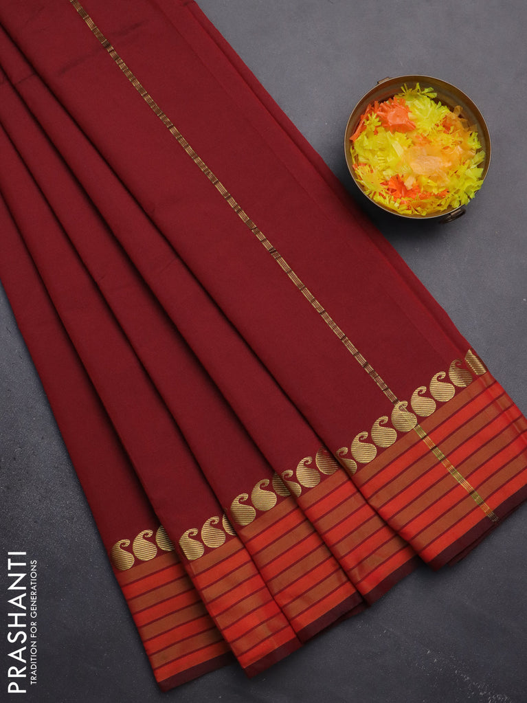 Arani semi silk saree maroon and dual shade of orange with plain body and paisley zari woven simple border