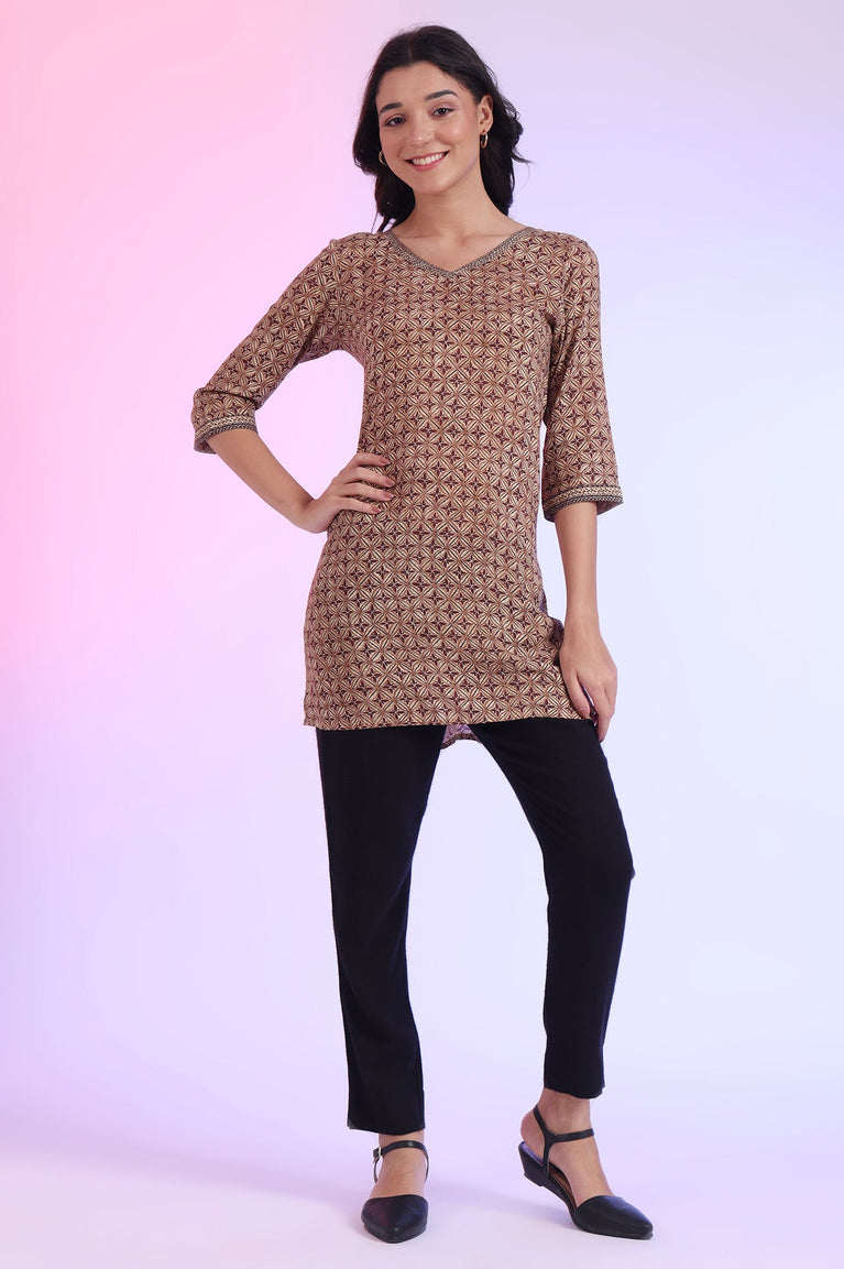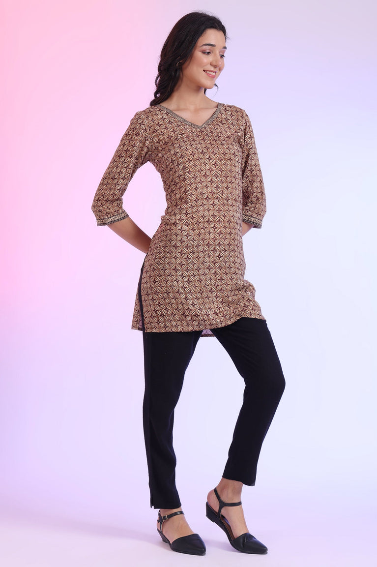 Introducing the Aurelia mid-thigh kurti, a fusion of style and comfort perfect for casual occasions. This madder brown kurti features a v-neck and three-quarter sleeves, crafted from 100% modal fabric for a luxuriously soft feel. The woven construction ensures durability, while the straight cut and slit detail add a touch of contemporary flair. Designed for women who appreciate both tradition and modernity, this kurti effortlessly bridges the gap between ethnic and western styles. The mid-thigh length makes it versatile enough to pair with various bottoms, from leggings to palazzos. Embrace the comfort of modal fabric, known for its breathability and drape, as you go about your day with ease. The v-neck adds a flattering element, elongating the neck and complementing various face shapes. Whether you're heading to a casual gathering or running errands, this Aurelia kurti is your go-to choice for effortless style.