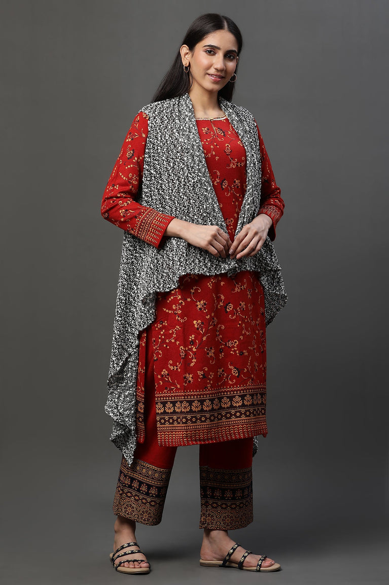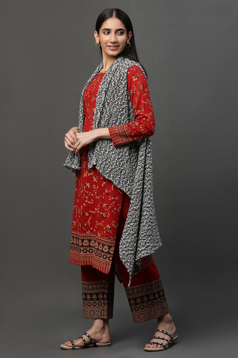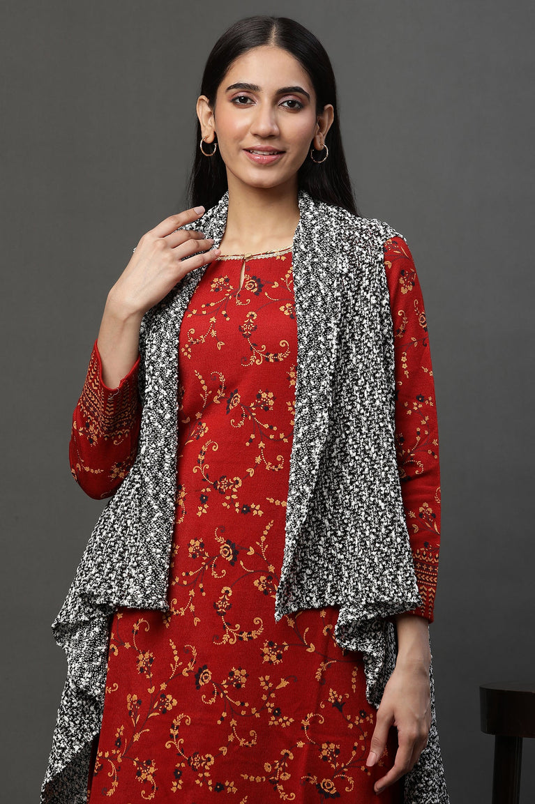Amp up your look with this pretty black and white checker kurta set. The set A-line kurta with braided white belt and has round neckline. It is paired with black solid tights.