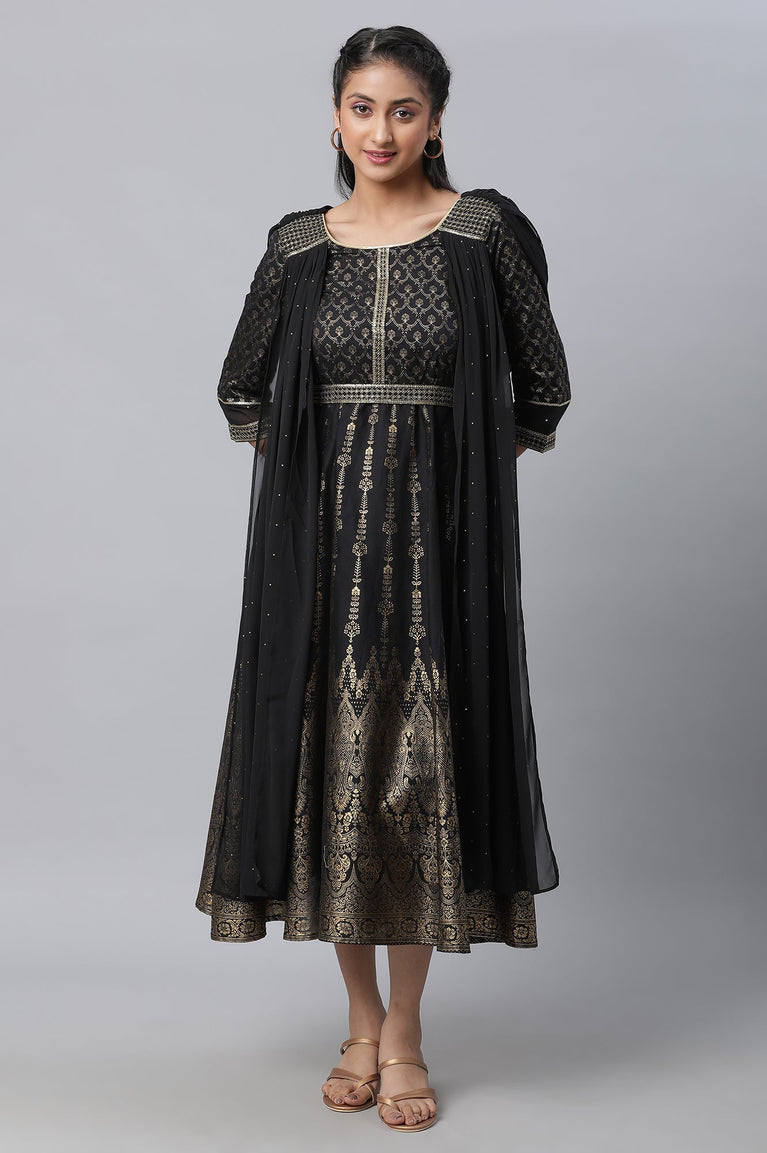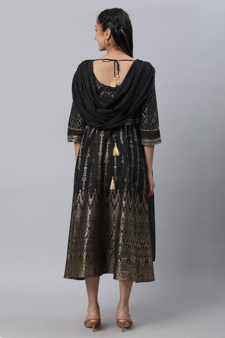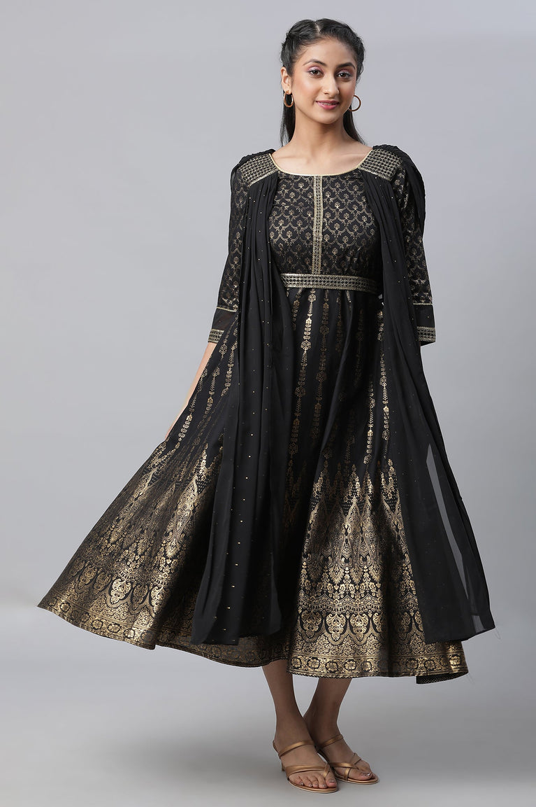 Black Zari Embroidered Flared Kurta, Pleated Skirt and Dupatta Set