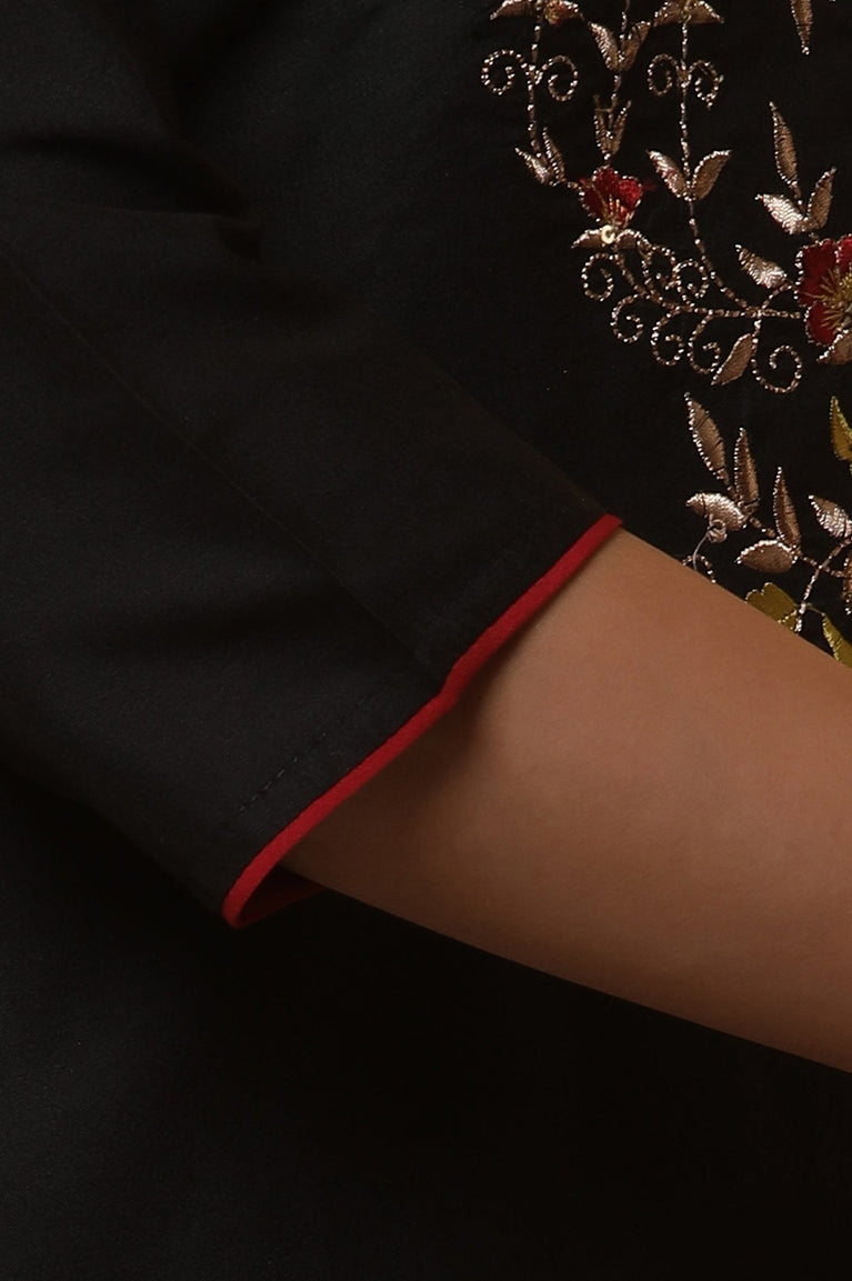Indulge in the timeless elegance of this classic black coloured embroidered kurta, made with a viscose poly fabric for a rich and lustrous look. The round neck is accentuated with cutout and tab detail, enhanced with contrast piping for a chic look. The intricate embroidery work adds a touch of sophistication to the overall design.