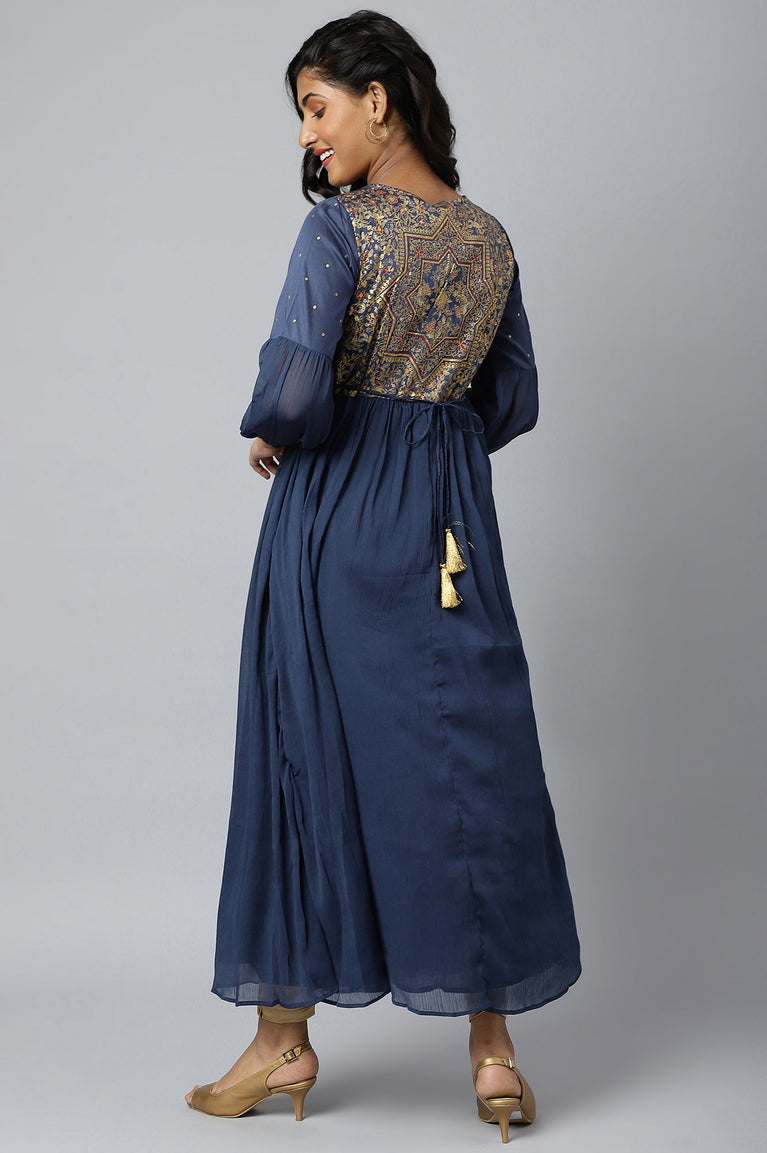 Midnight Blue chiffon LIVA dress with an ornate gold foil printed yoke is sure to make you feel an indian princess fantasy. This dress has a stylised sleeve detail. You can wear it as it is or pair it with our classic gold woven dupatta.