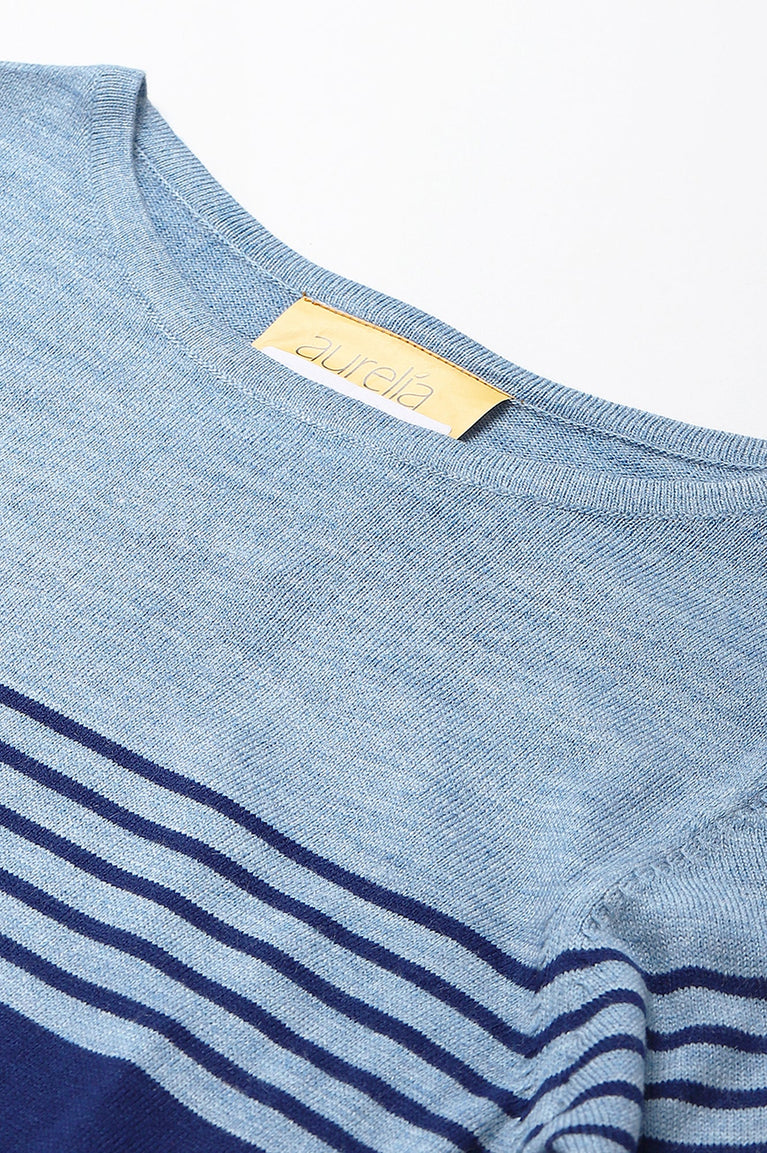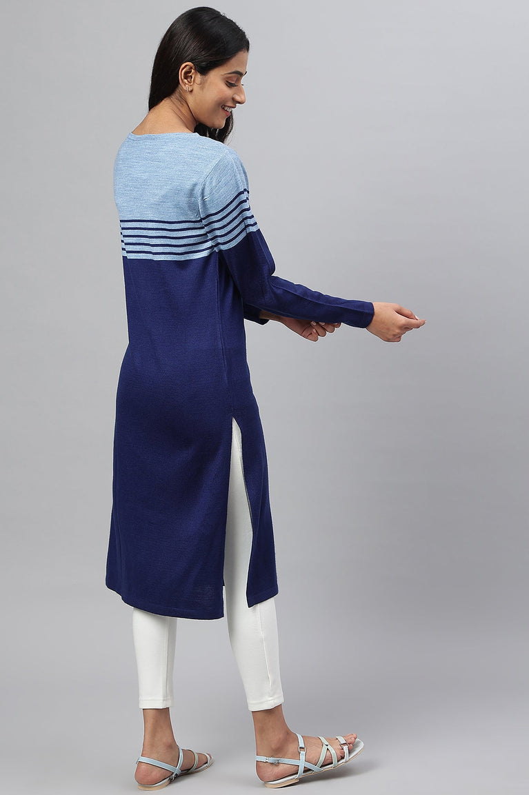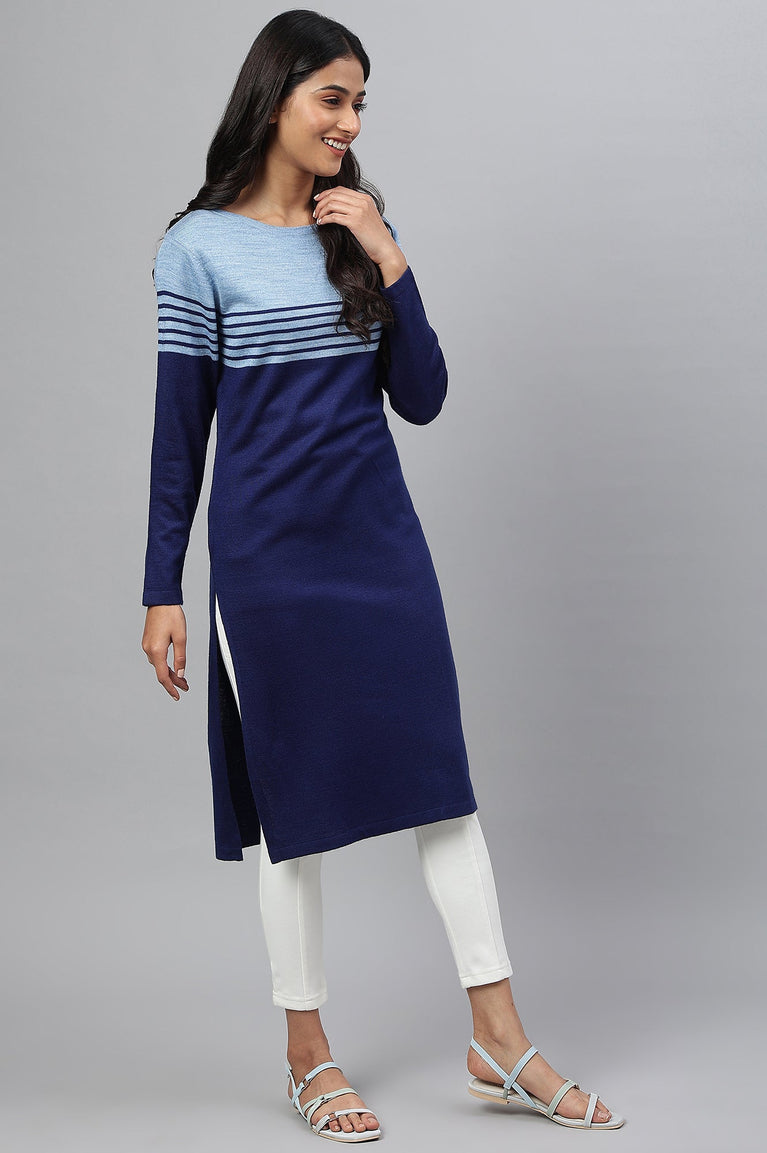 This blue collar neck 3/4 sleeve kurta has side slits.
