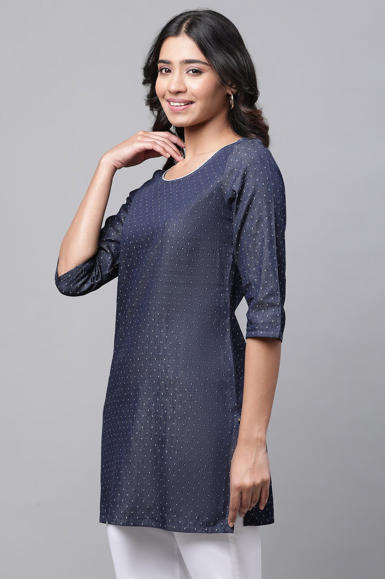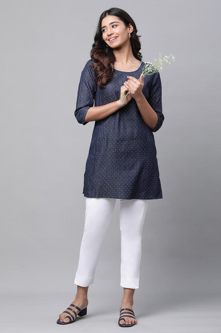 Crafted in premium fabric, which gives you all day comfort and classy look. This short denim kurti has round neck and white dot print.