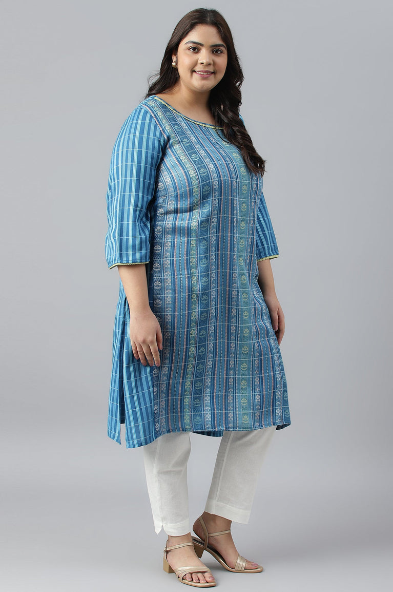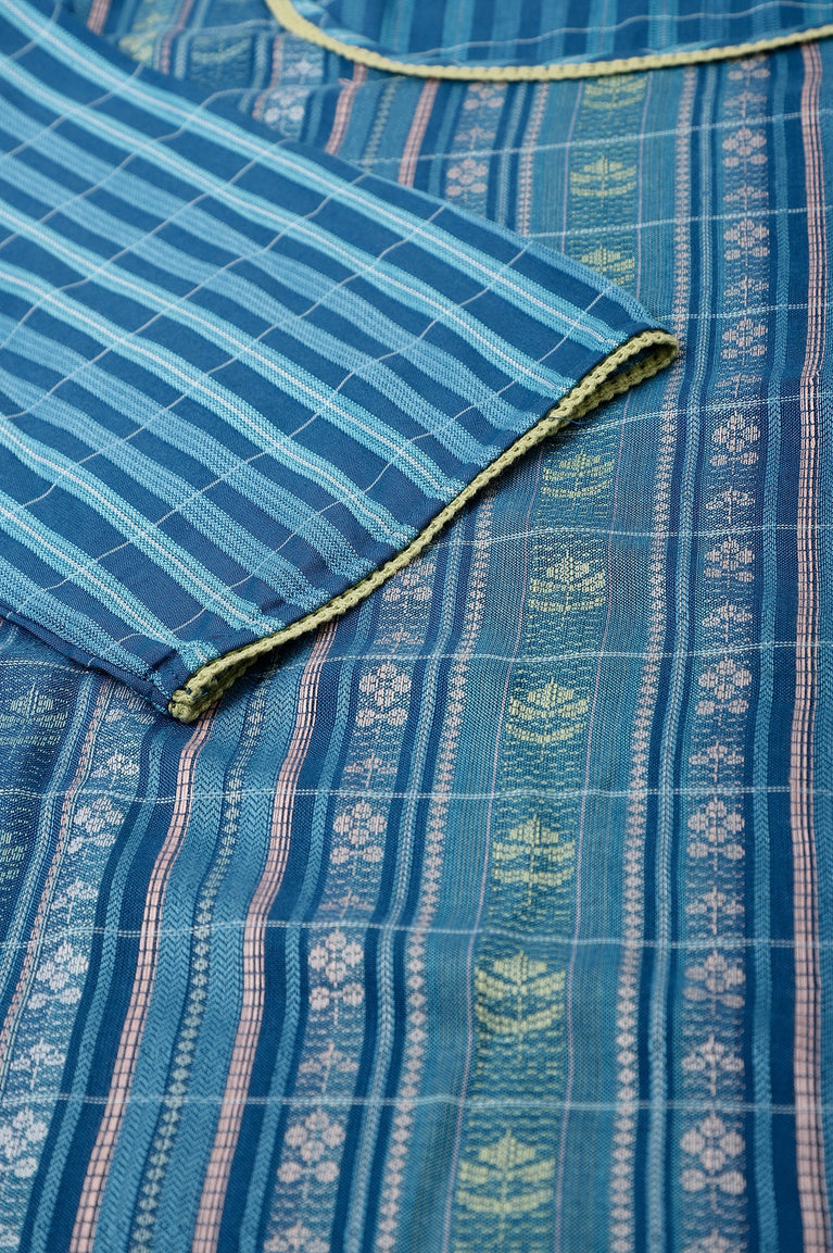 Blue dobby kurta in round neck and 3/4th sleeves paired with blue flared palazzo pants in elasticated waistband and mid-rise.