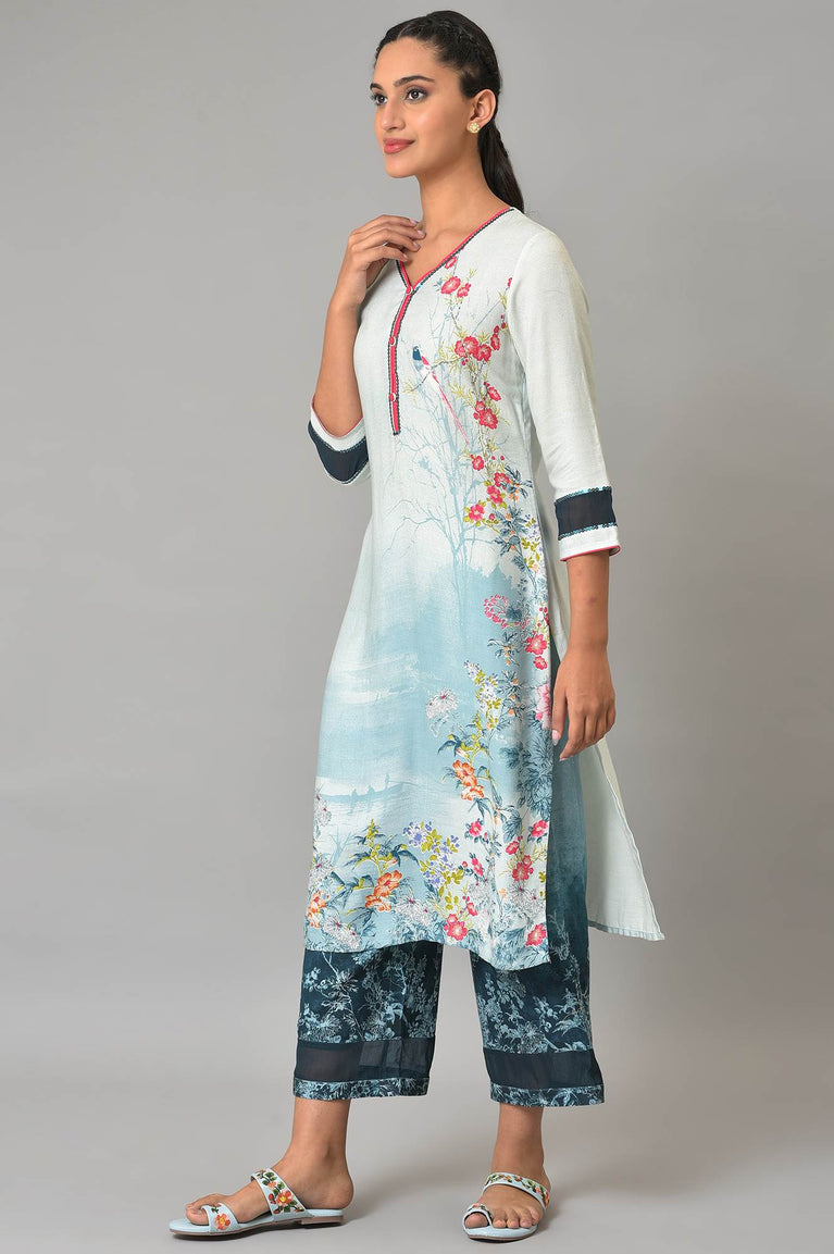 Blue Floral Printed Lace Chiffon Straight Kurta, Parallel Pants and Dupatta Set