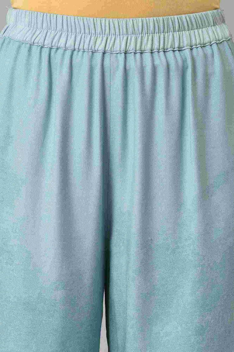 Blue Floral Printed Lace Rayon Flared Kurta, Pants and Dupatta Set