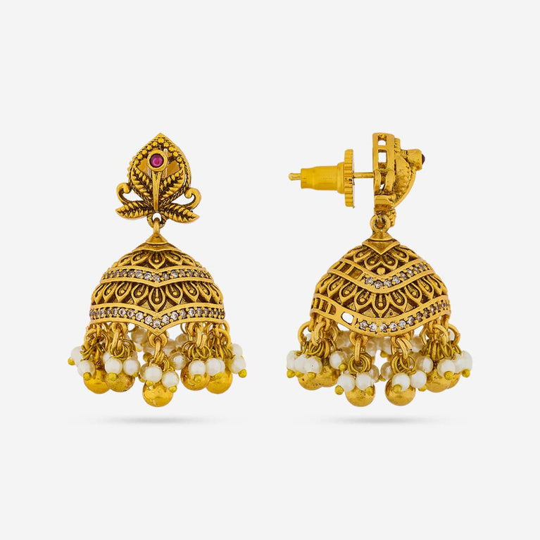 Intricate, festive, and contemporary, this fine ring is all. Adding a refreshing feel of full bloom, the white pearls, embossed gold plated floral design, floral rim, and hint of ruby stone, makes your look more exquisite and unique.
