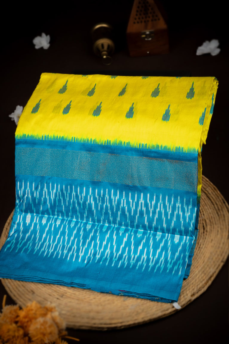 Mandir Lime Yellow & Teal Blue Ikat Ikat Saree