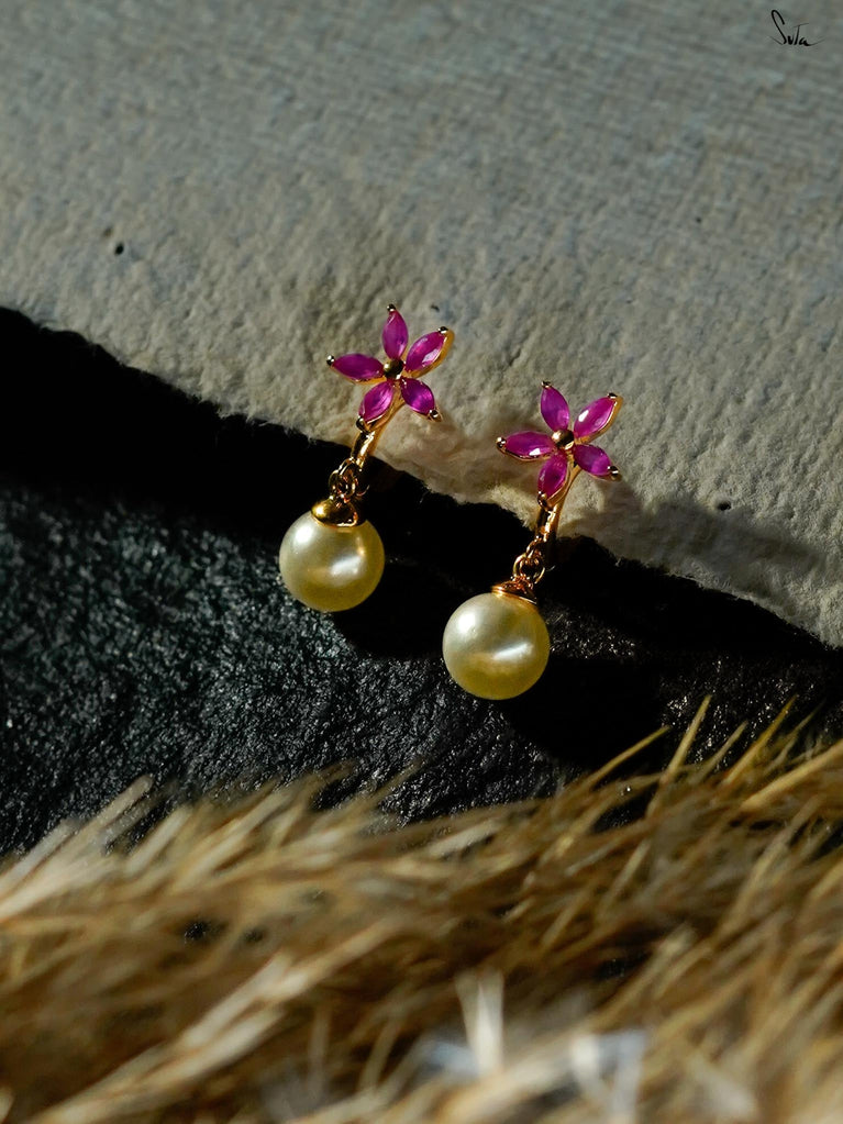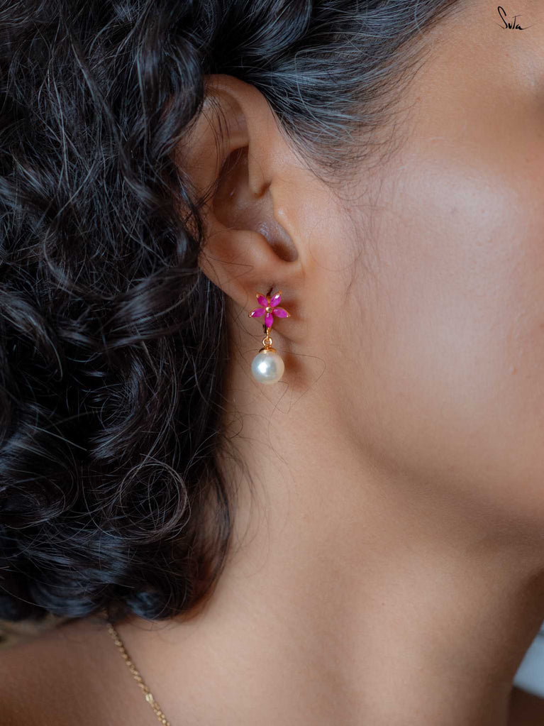 Micro-gold hoops made in sterling silver, studded with pearl and ruby. A perfect circle to hold peace inside. Your go-to for centered, chic days.