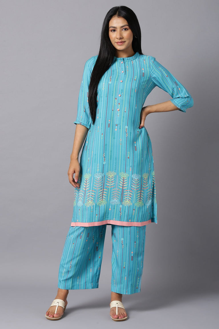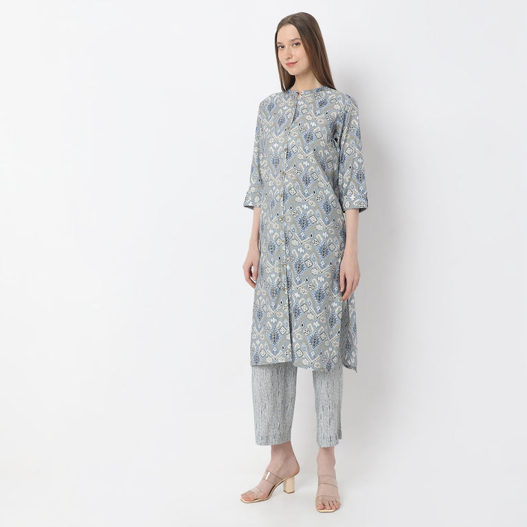 A-Line Printed Band Collar Kurta With Pant Set