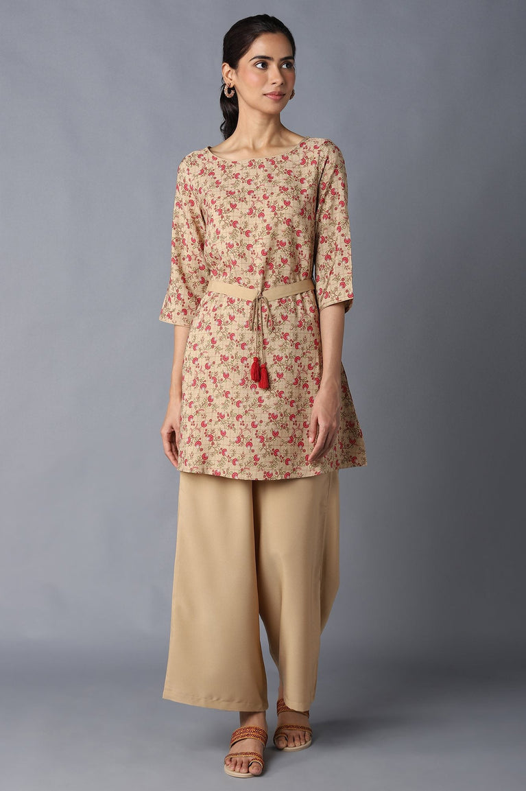 Brown Floral Print A-Line kurta With Belt And Having Boat Neckline. It Is Coordinated With Palazzo Pants In High-Rise.