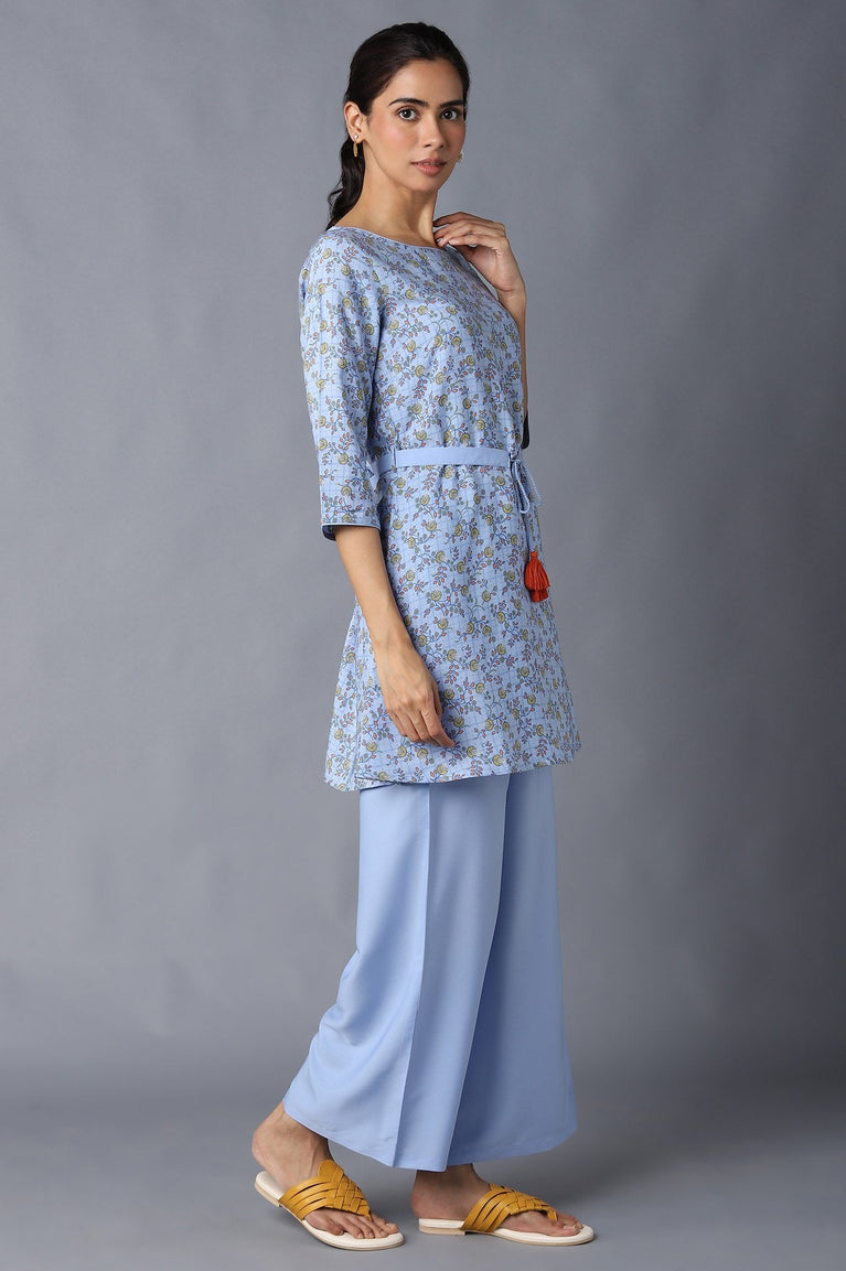 Blue Floral Print A-Line kurta With Belt And Having Boat Neckline. It Is Coordinated With Palazzo Pants In High-Rise.