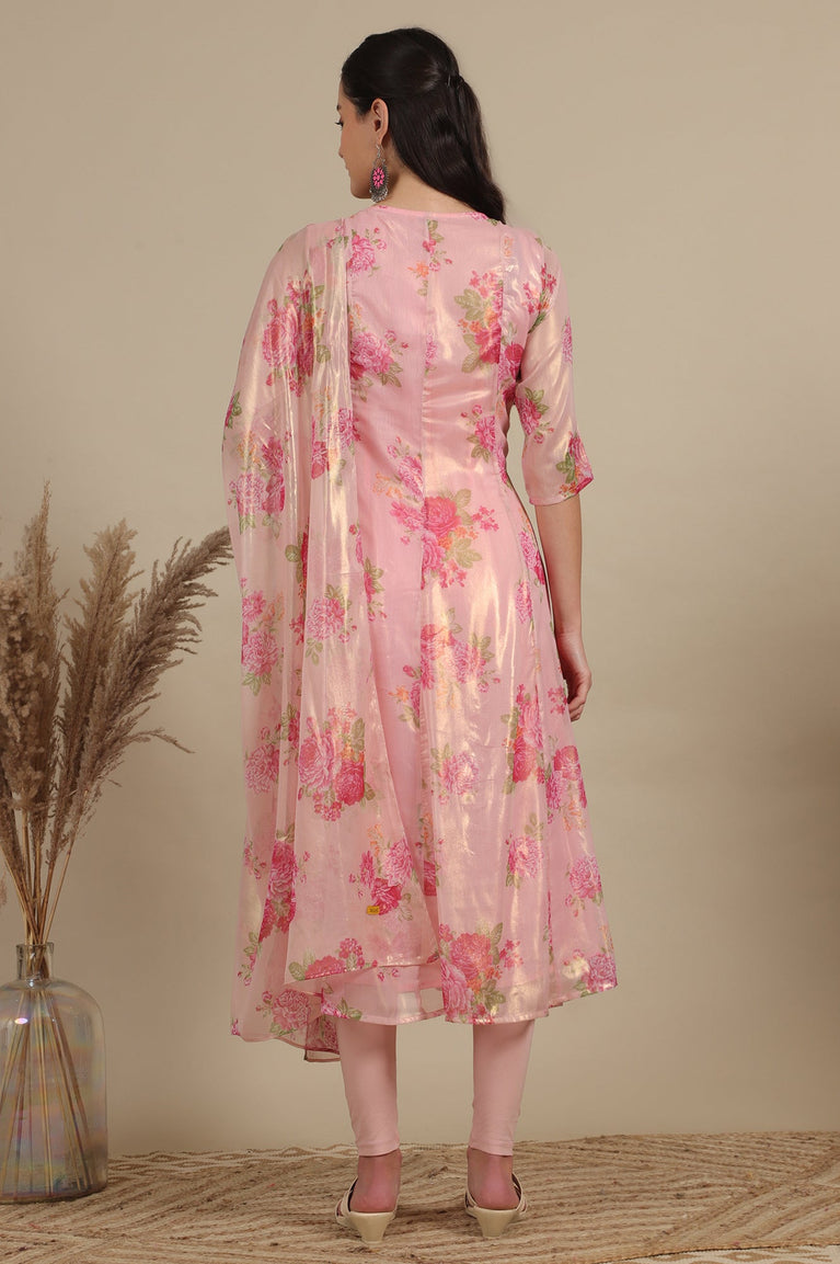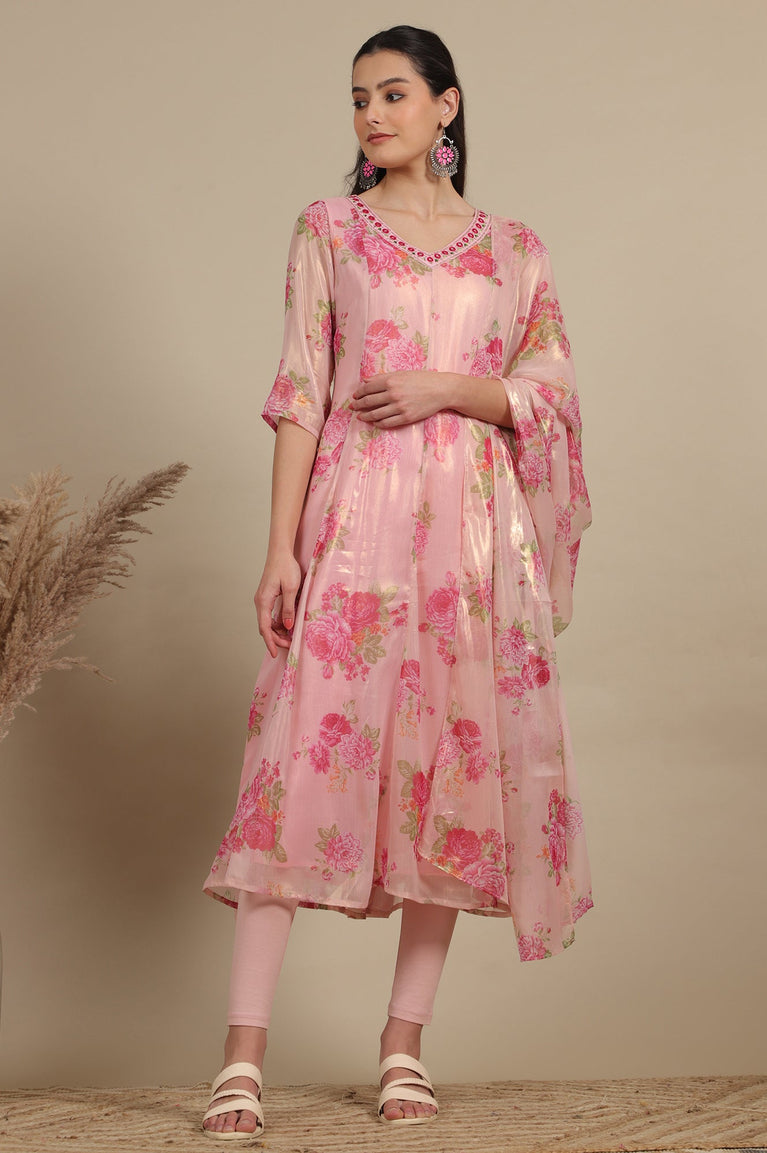 Apricot Pink Floral Printed Sheer Anarkali Kurta, Leggings and Dupatta Set