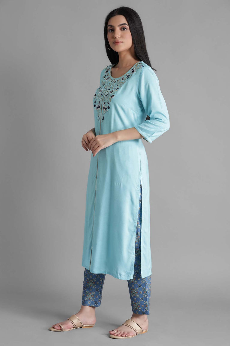 Blue Embroidered Straight kurta-Parallel Pants-Dupatta Set