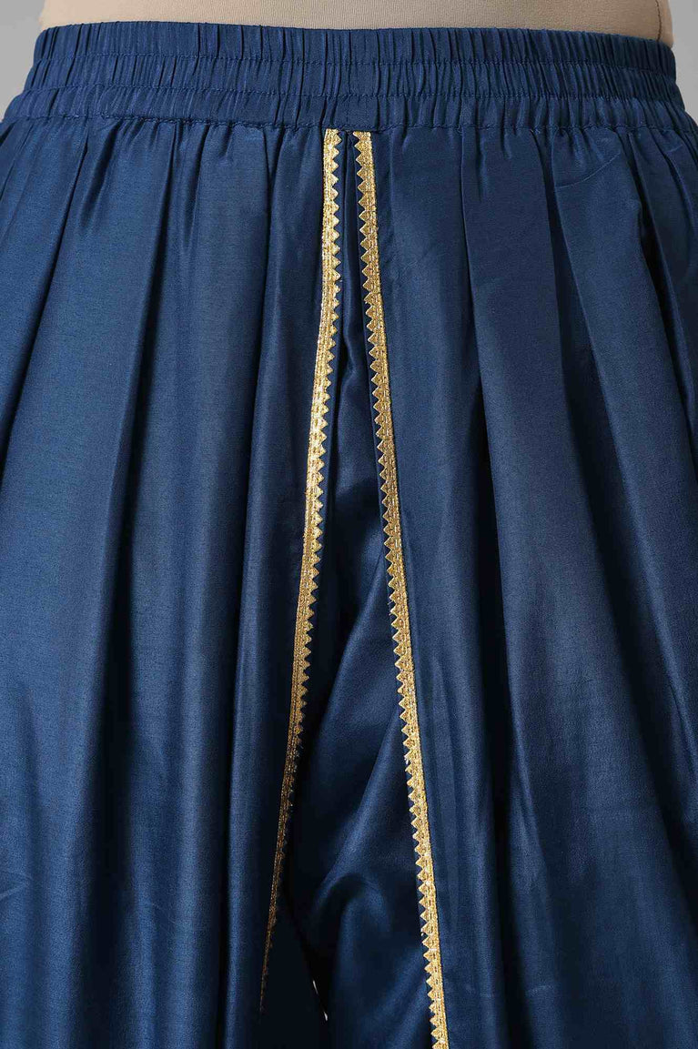 Dress up in the classic silhouettes with intricate detailing, lavish prints and rich hues to accentuate your festive look. This kurta set contains a blue glittered geometric print panelled kurta featuring zari embroidered yoke with round neckline and three-quarter sleeves. Well-matched with ankle length solid palazzos.