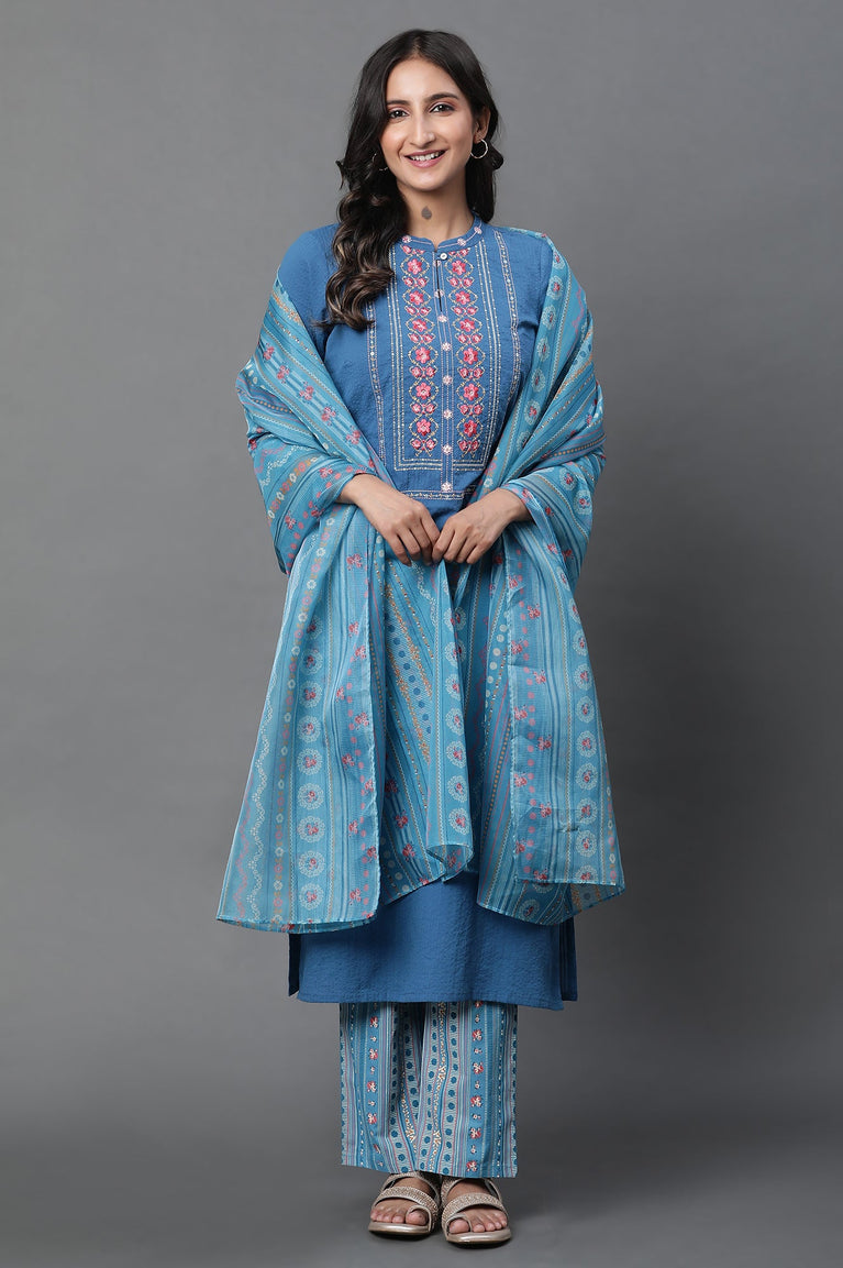 Blue Embroidered Pure Cotton Straight Kurta with Palazzos & Dupatta Set