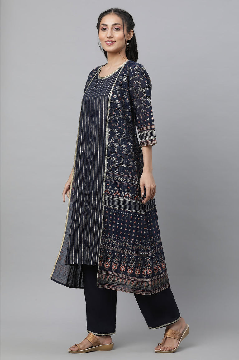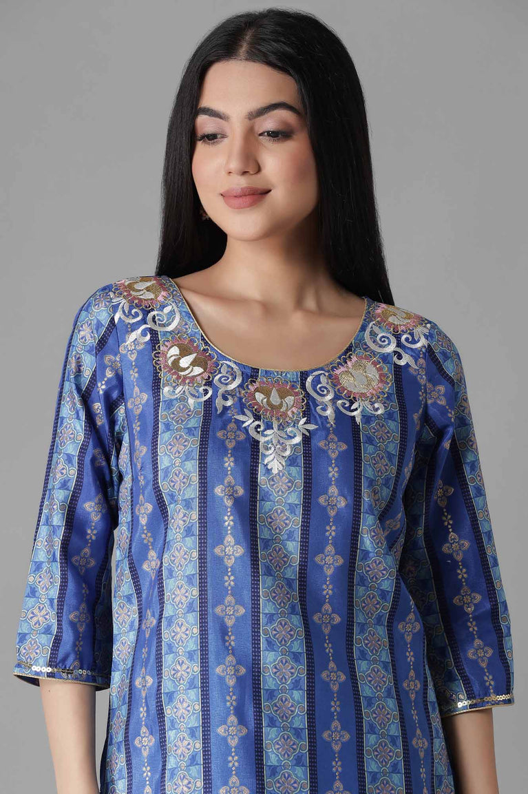 Be dressed la mode this festive season. Perfect for all occasions, this kurta set contains a blue all-over striped foil print kurta well-matched with solid palazzos.