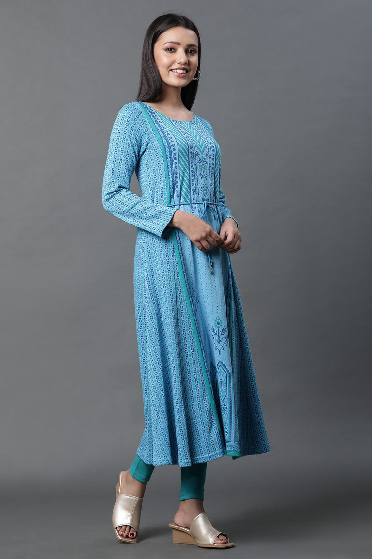 Blue Printed Flared Kurta, Tights and Dupatta Set