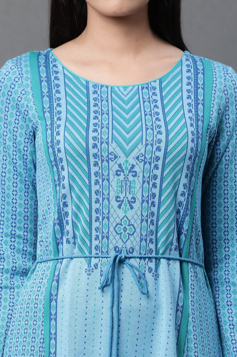 Blue Geometric Printed Straight Fit kurta. This Light Festive kurta Has Tie Up Sleeves And Round Neckline. It Is Coordinated With Pink Solid Cotton Jersey Tights.