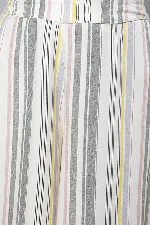 get ready for a striking summer look in this pretty baby pink kurta set. The set has straight kurta with contrast piping details. And it is paired with multi-coloured stripes culottes.