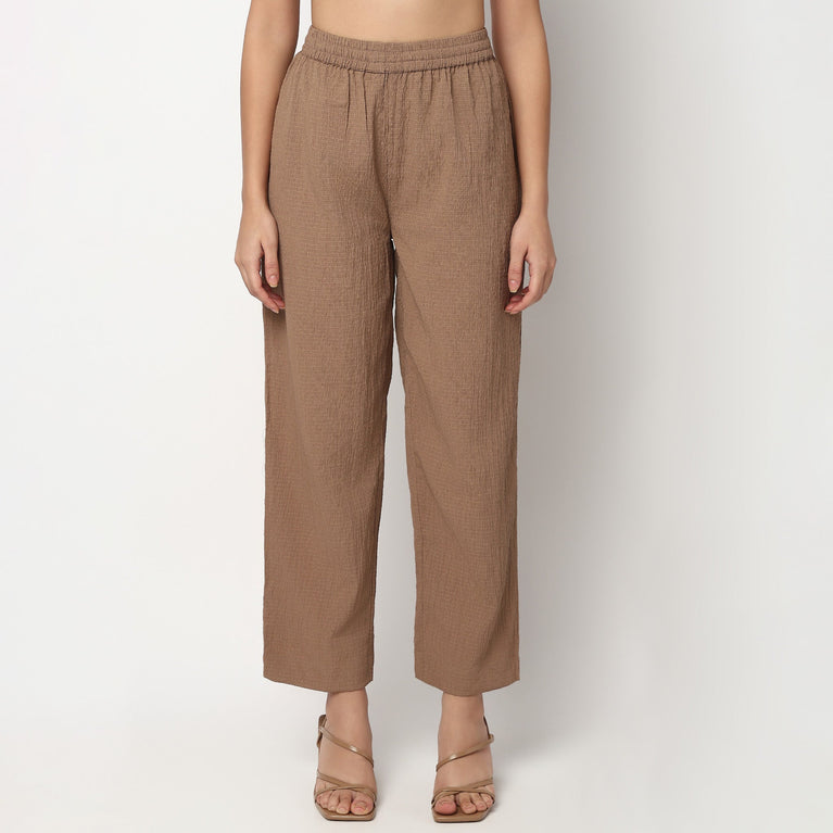 Step Out In Confidence With This Stunning And Statement-Making Modern Ethnic Suit Set. The Set Includes Brick Red Solid Round Neck kurta In Staright Silhouette, It Features Thready Embroidery. kurta Is Coordinated With Dark Peach Straight Palazzo Pants.