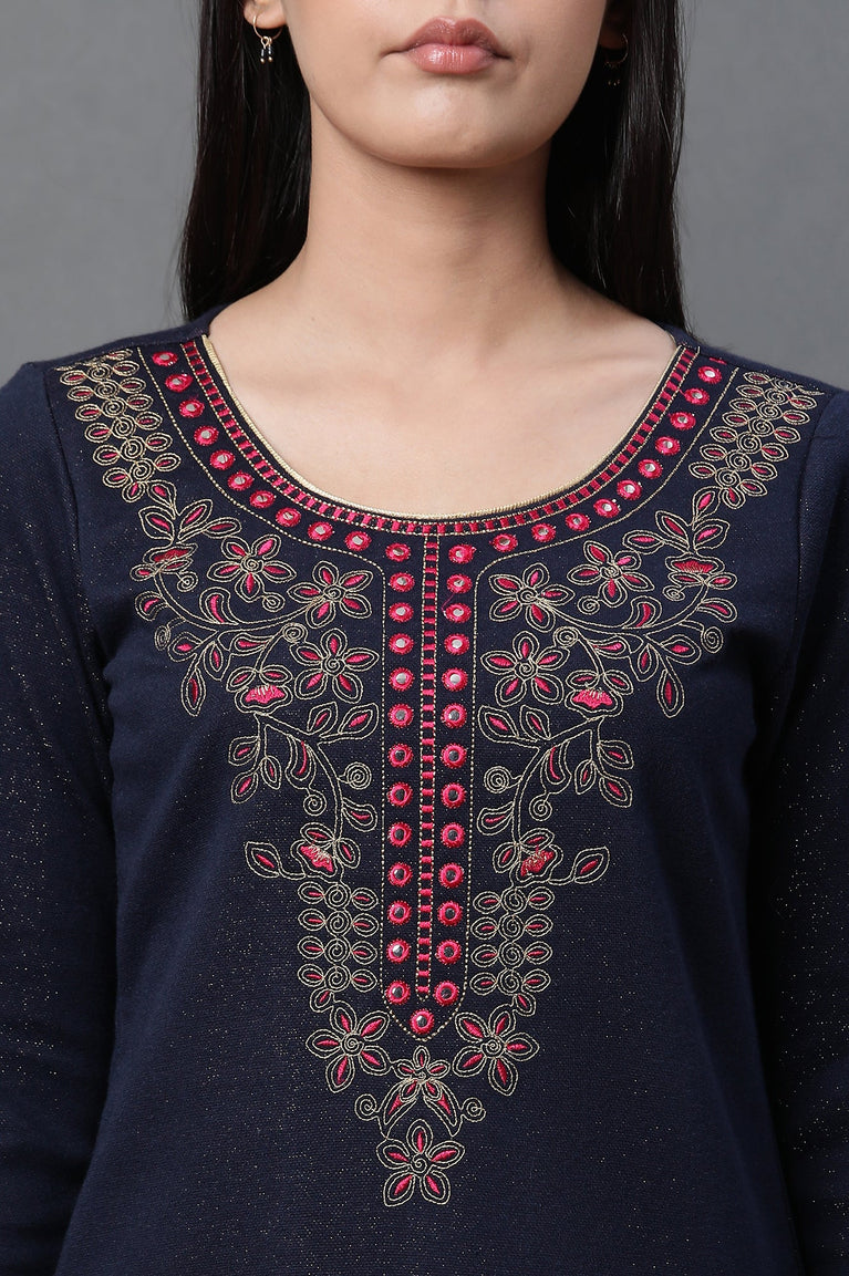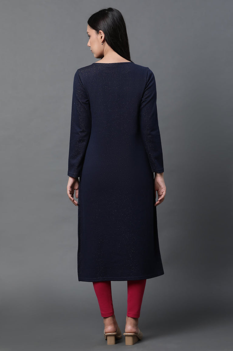 Blue Warm Jacquard Winter Kurta and Tights Set