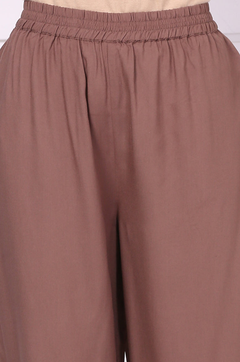 Upgrade Your Wardrobe By Adding This Elegant And Chic Ethnic Set. The Set Includes Brown kurta In Straight Silhouette. It Has Floral Motifs And Comes In Round Neck With Keyhole. It Is Coordinated With Red Straight Palazzo Pants In High-Rise And Elasticated Waistband.
