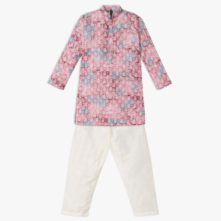 These printed pattern kurta with pant set has mandarin collar and full sleeve. Made from polyester cotton, your kid's feel comfortable wearing the product.
