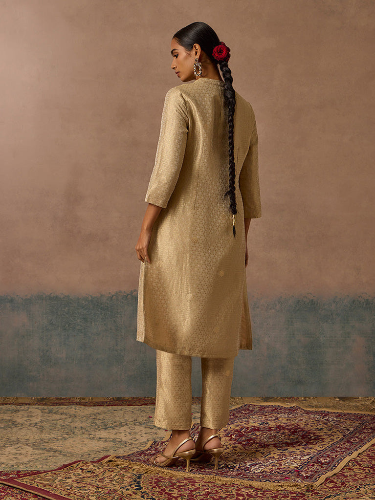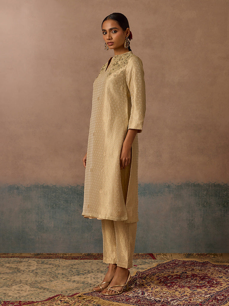 A polished festive set that balances gentle sheen with intricate craft. The straight kurta is tailored in lustrous jacquard, woven with a subtle geometric pattern that catches light softly. The split V-neckline and three-quarter sleeves keep the silhouette easy, while embroidered detailing across the front brings an elegant finish. The matching pants complete the set with an elasticated waistband that stays comfortable through long hours of dressing.