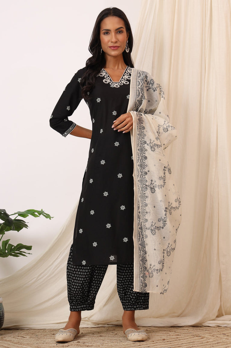 Revamp Your Traditional Wardrobe With This Elegant Yet Stylish White kurta Set. This Contemporary Set Includes Black Chanderi kurta In Floral Motifs And A-Line Silhouette. It Is Coordinated With Black Slim Pants In Mid-Rise And Partially Elasticated Waistband.