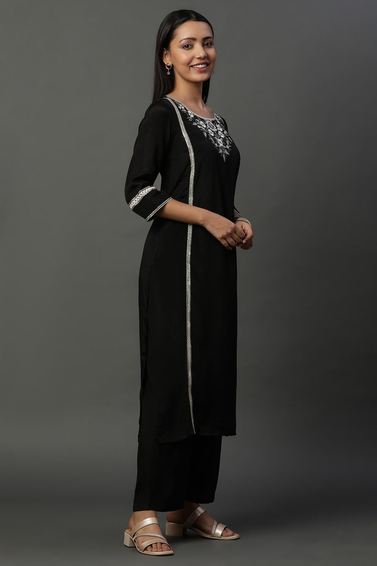 Black Zari Embroidered and Sequins Viscose Blend Straight Kurta and Palazzo Set