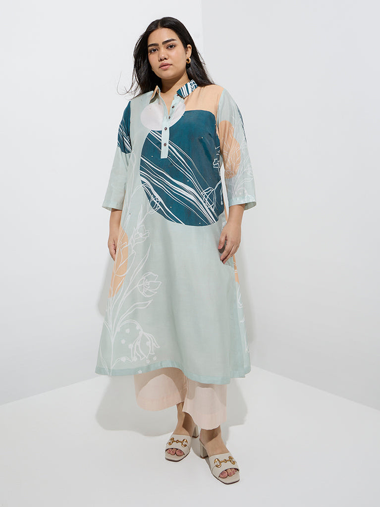 This multicolour kurta from Diza blends floral prints with geometric motifs, creating a striking and distinctive visual appeal. Woven from a lightweight fabric in an A-Line frame, it features a crisp collar, a quarter button placket, and three-quarter sleeves for effortless style. A discreet slip pocket adds practical utility.