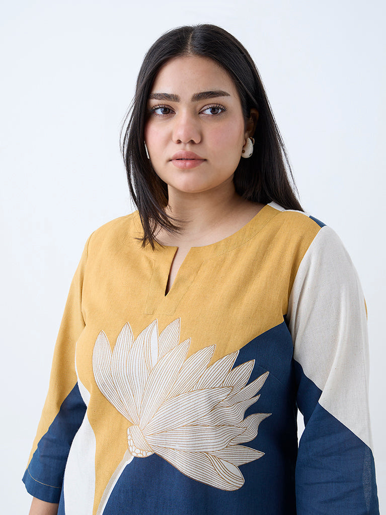 This indigo kurta from Diza is brought to life with graceful botanical prints that offer a refreshing contrast against its deep base. Tailored from a breathable fabric in a flattering A-line silhouette, it’s styled with a crisp collar, a short button-down placket, and three-quarter sleeves for a polished finish. Thoughtfully designed with a slip pocket, it blends everyday ease with artistic flair.