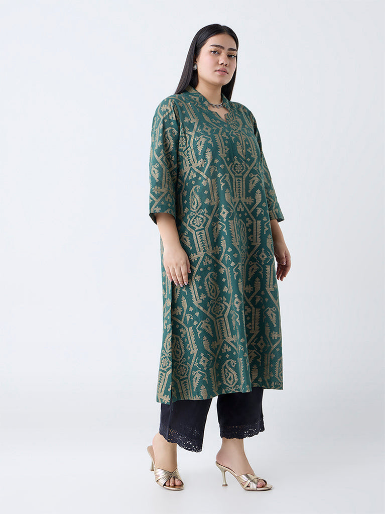 Diza Green Jamdani-Printed Cotton-Blend A-Line Kurta