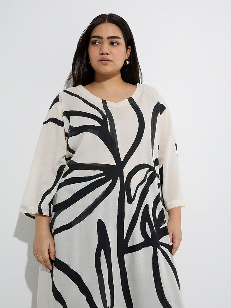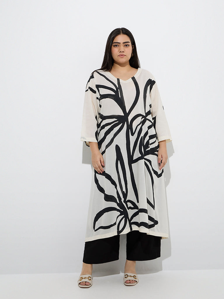 Diza launches this elegant off-white A-line kurta, adorned with delicate botanical prints for a refreshing appeal. Designed with a stylish asymmetrical neckline, three-quarter sleeves, and practical side pockets, it blends timeless charm with everyday comfort.