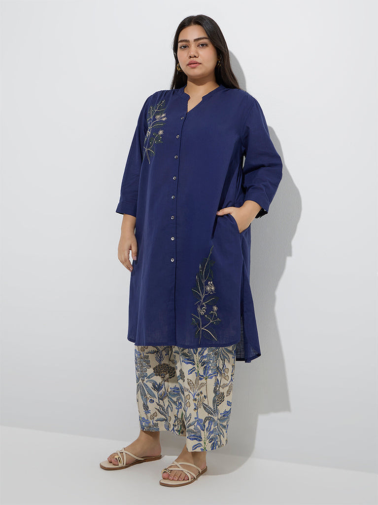 Carved in a straight silhouette, this navy kurta from Diza will amplify your festivities. Showcasing intricate botanical embroidery at the front, it features a mandarin neck that extends to a button placket and three-quarter sleeves. Finished with a functional slip pocket, this pure-cotton piece blends charm and convenience for effortless everyday wear.