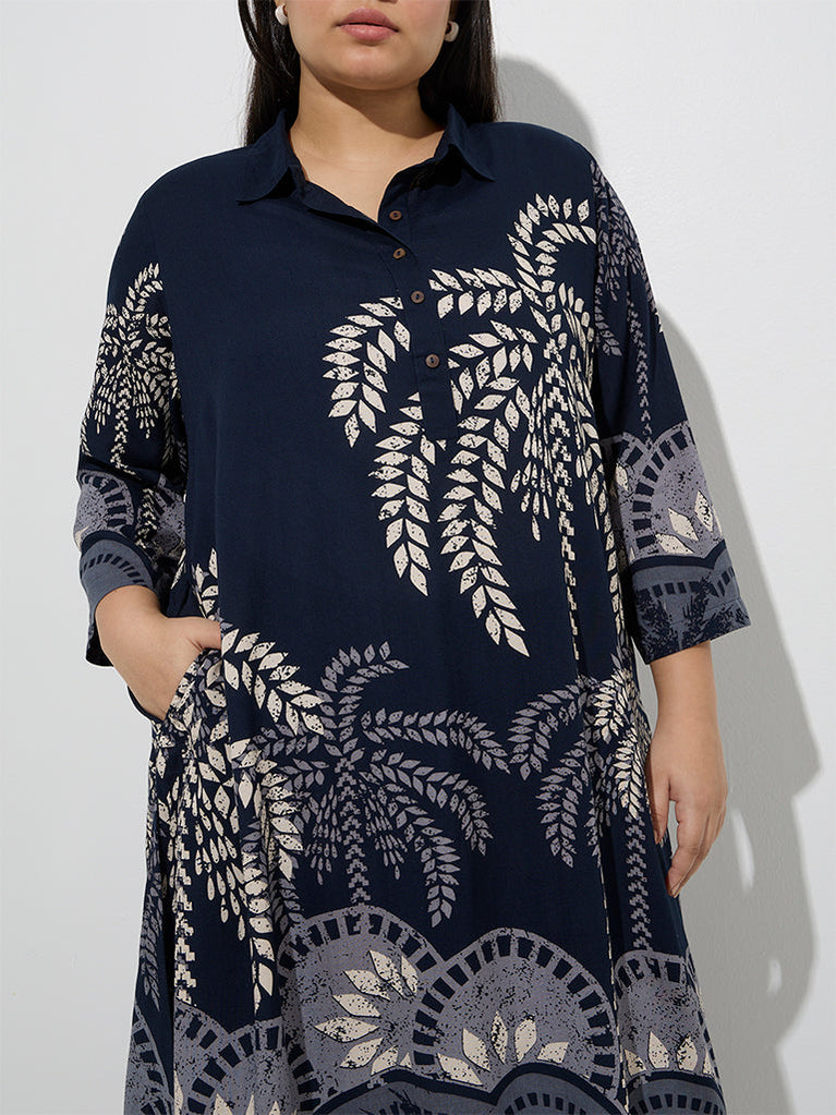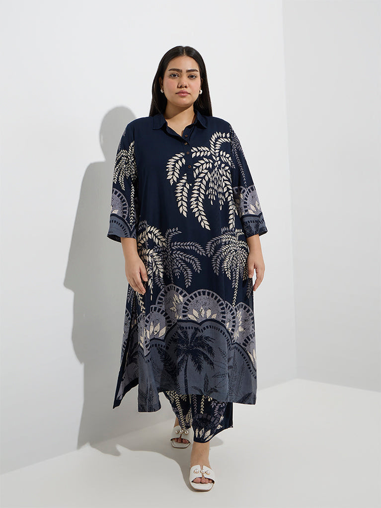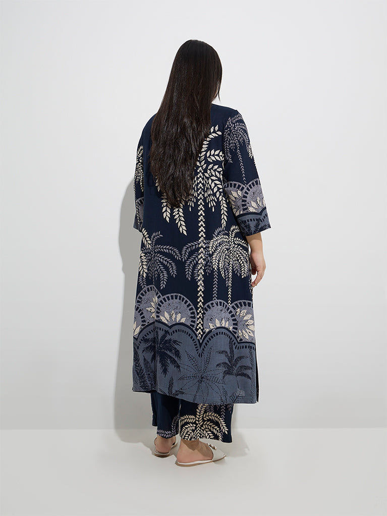 This navy kurta from Diza showcases tropical-inspired prints that lend it a relaxed yet refined appeal. Milled from an ultra-soft fabric and cut in a graceful A-line silhouette, it features a neat collar, a short button placket, and three-quarter sleeves for everyday ease. A discreet slip pocket adds a thoughtful touch of practicality to this wardrobe staple.