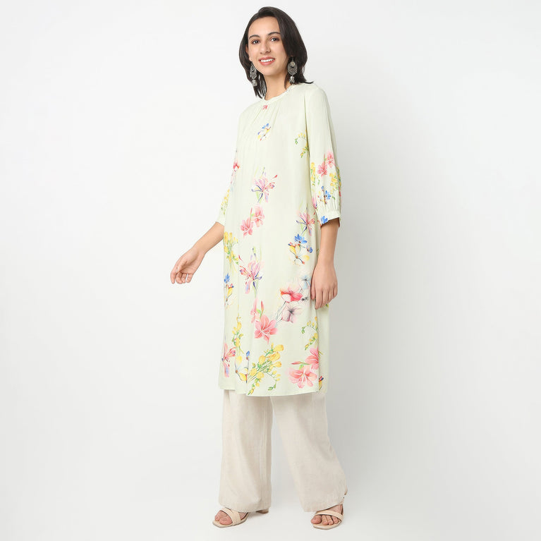 Band Neck Knee Length Three-Fourth Sleeve Straight Fit Printed Kurta