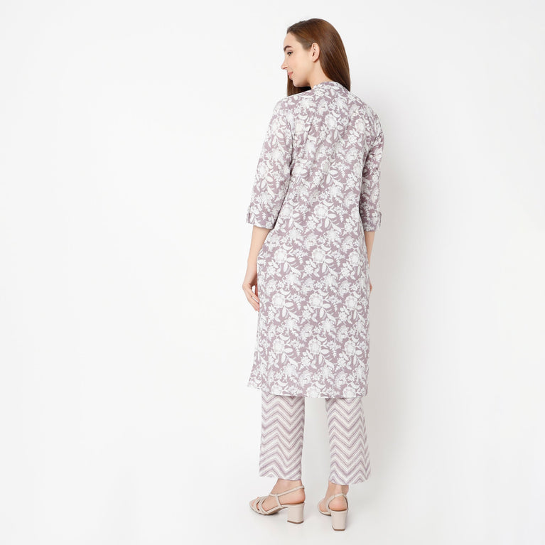 Band Collar Below Knee Three-Fourth Sleeve Flare Fit Printed Kurta
