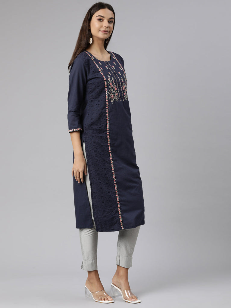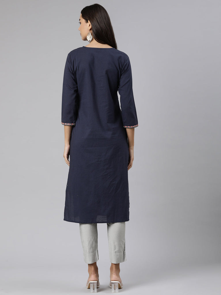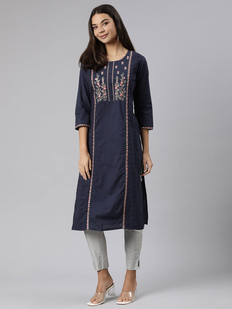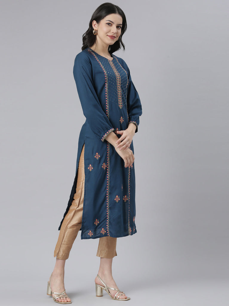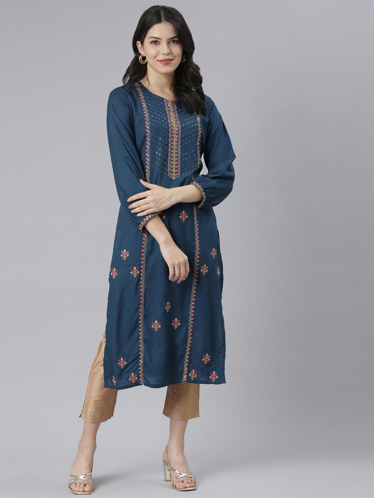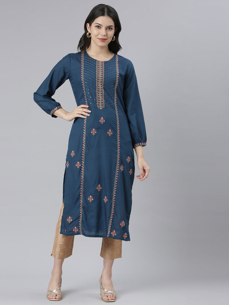 Neeru's Blue Regular Straight Embroidered Kurtas