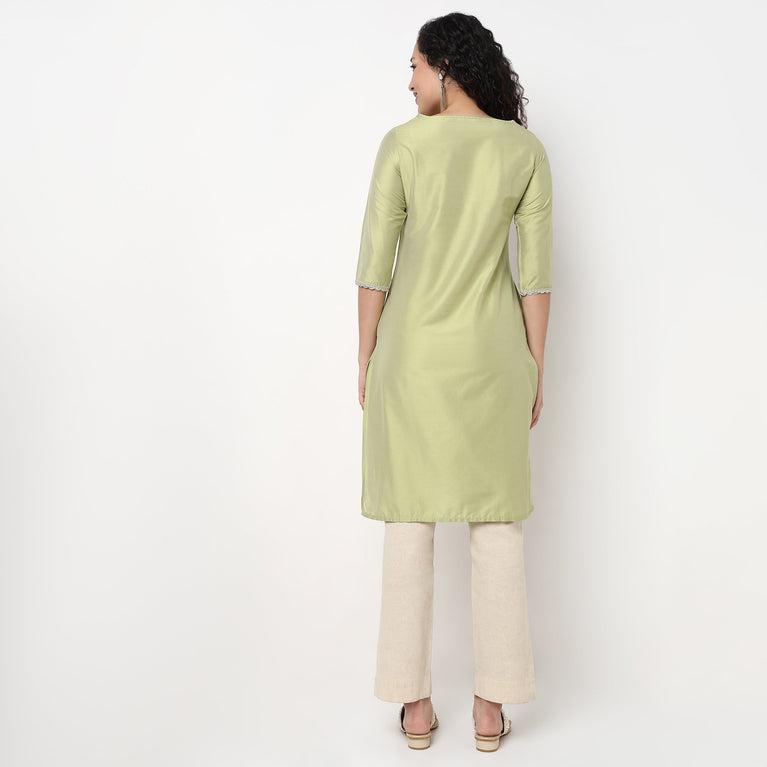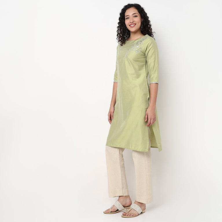 This embroidered pattern kurta has a round neck and three-fourth sleeve. Made from cotton, it is soft and comfortable to wear.
