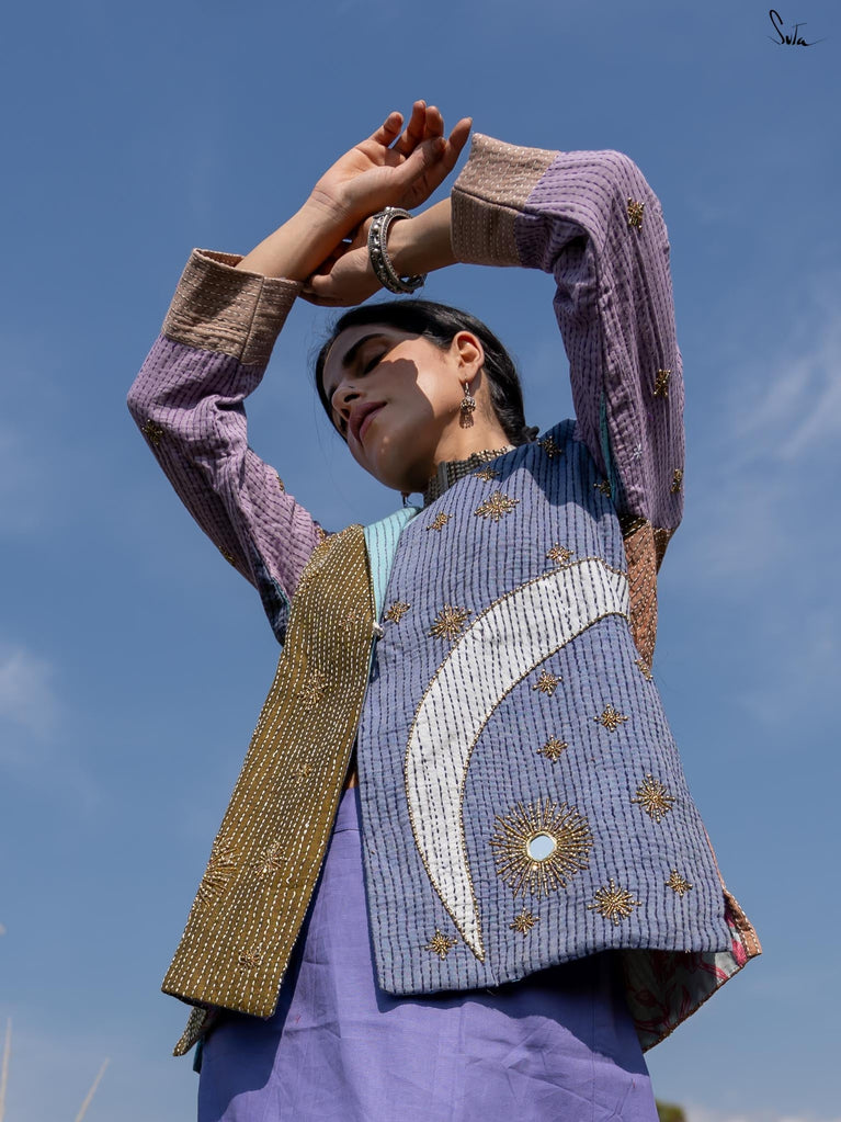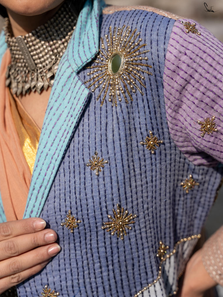 Arue celebration of craftsmanship, Chand Buta from Suta’s Bageecha collection reflects the immense time, love, and hard work that our artisans have invested. The jacket is hand-quilted in a multicolor fabric, with the Katha running stitches laying the foundation for its vibrant design. The stunning mirror work, bead embellishments, and zari embroidery are all carefully handcrafted, requiring meticulous skill and hours of patience. These elements give the jacket its glamorous and festive feel, making it a unique piece that stands out. The artisans love for their craft is evident in every stitch and bead, as they pour their heart into transforming the fabric into a work of art. The jacket is not just a piece of clothing, but a canvas of tradition and modernity, woven together with love and time. Each element is passed from one pair of hands to another, carrying the stories and dedication of the craftsmen who have worked tirelessly to create something beautiful.
