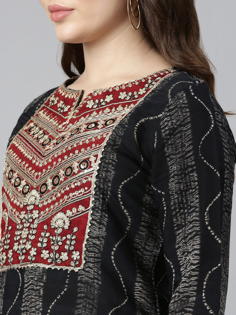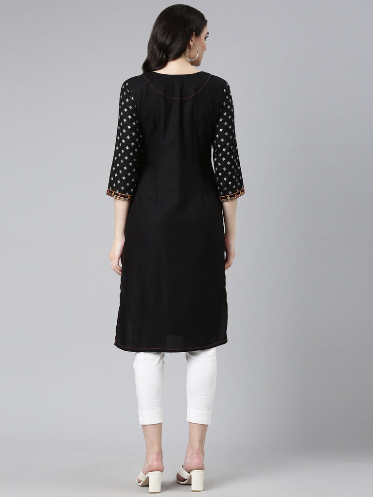 Neeru's Black Regular Straight Embroidered Kurtas This Flirty Kurta Is Perfect For Sprucing Up Your Warm-Weather Wardrobe. Add A Bit Of Boho Vibes To Your Look With The Embroidered Details And Flirty Silhouette!