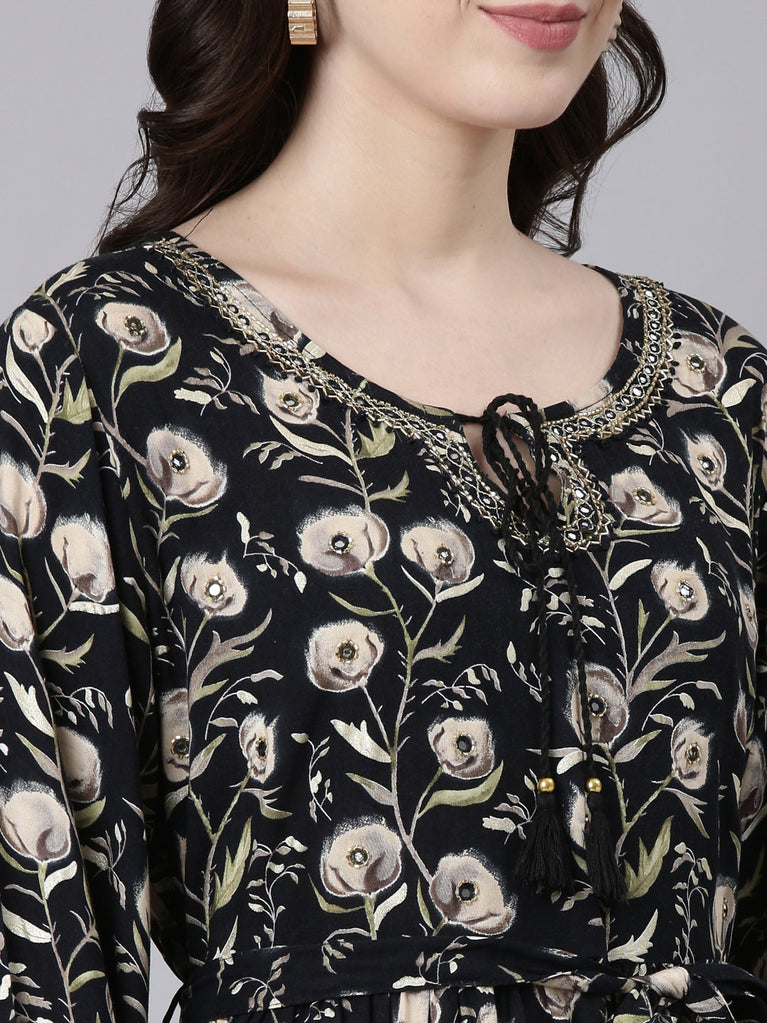 Neeru's Flared Floral Dresses In Black - Perfect For Any Casual Occasion.