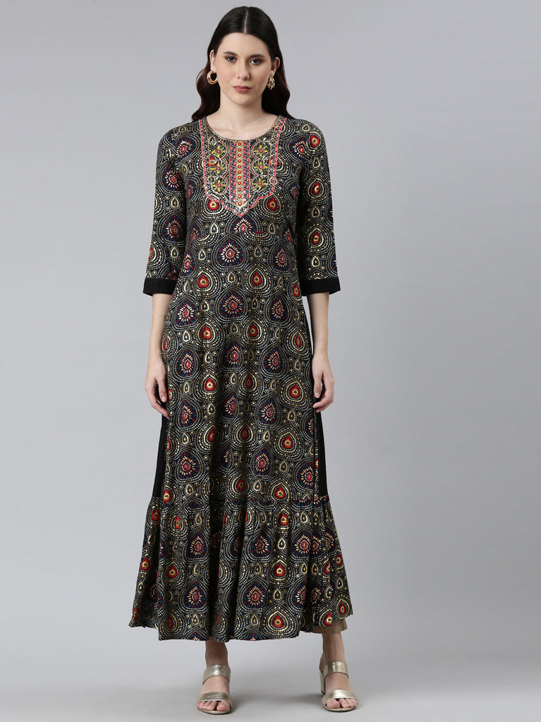 Neeru's Black Flared Casual Printed Fit And Flare Dresses