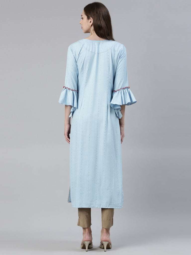 This Sophisticated Kurta By Neeru's Flaunts An Elite Yoke Design And Notch Neck Detailing, Accompanied By Thread Work Artistry. Crafted From Luxuriant Viscose Rayon, It Comes With Side Slits And Three-Quarter Length Sleeves, And Is Cut In A Flattering Straight Shape To A Calf-Length Hemline. Step Out With Confidence Every Day In This Beautiful Blue Ensemble.