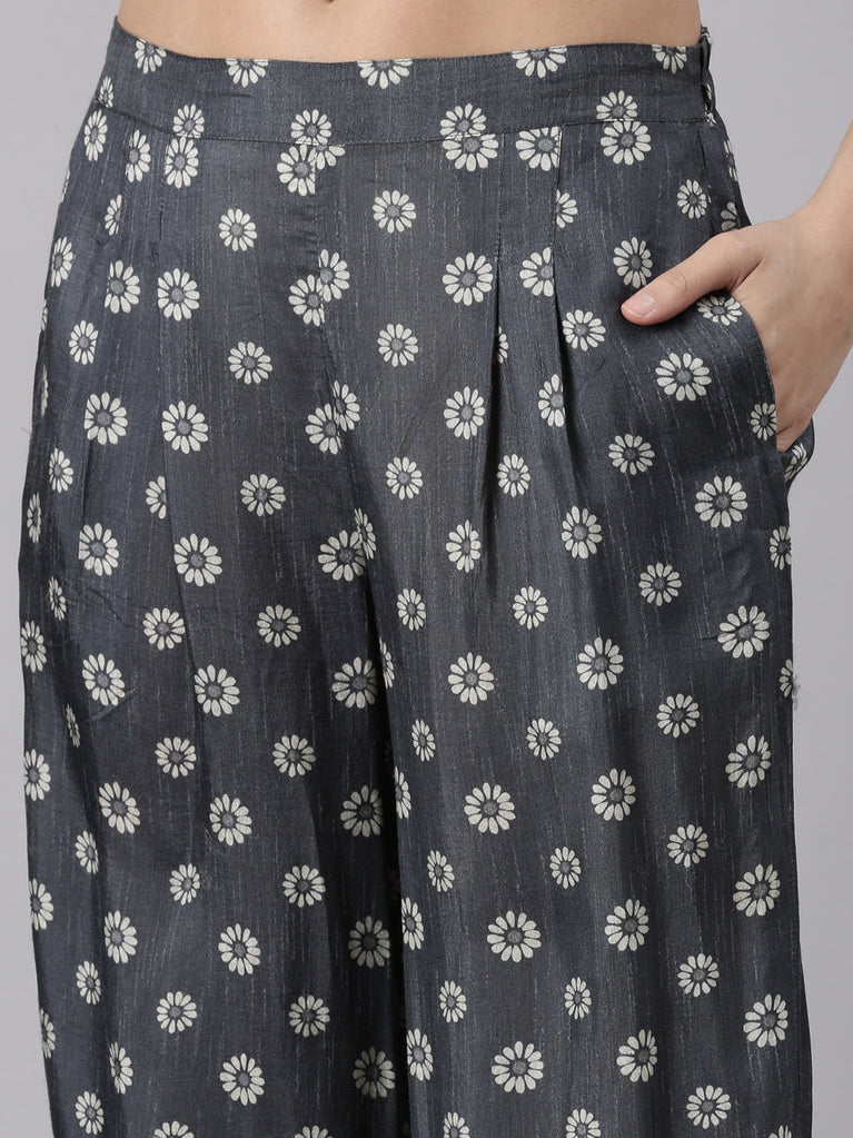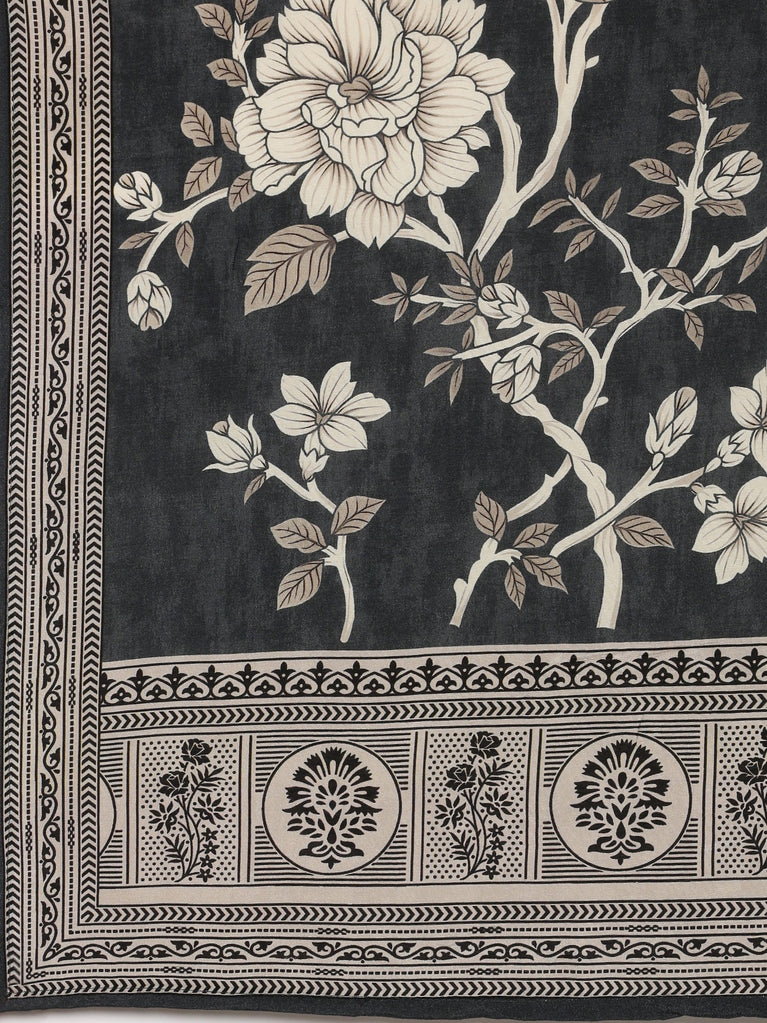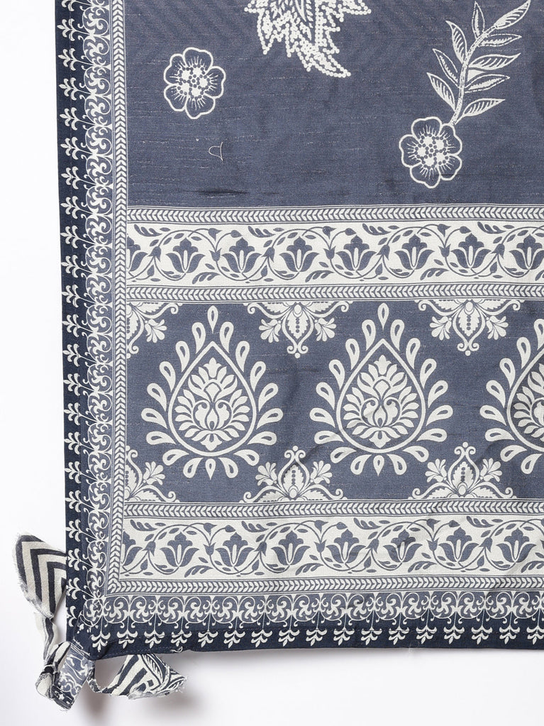 Grey Muslin Printed A-Line Three Piece Set