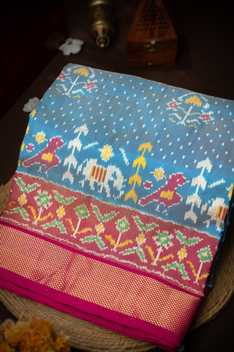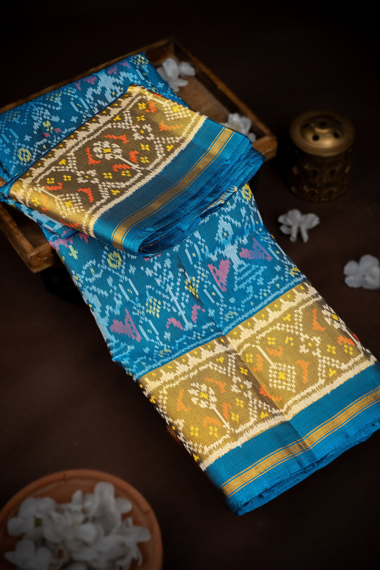 Mandir Aqua Blue & Olive Green Patan Patola Ikat Saree